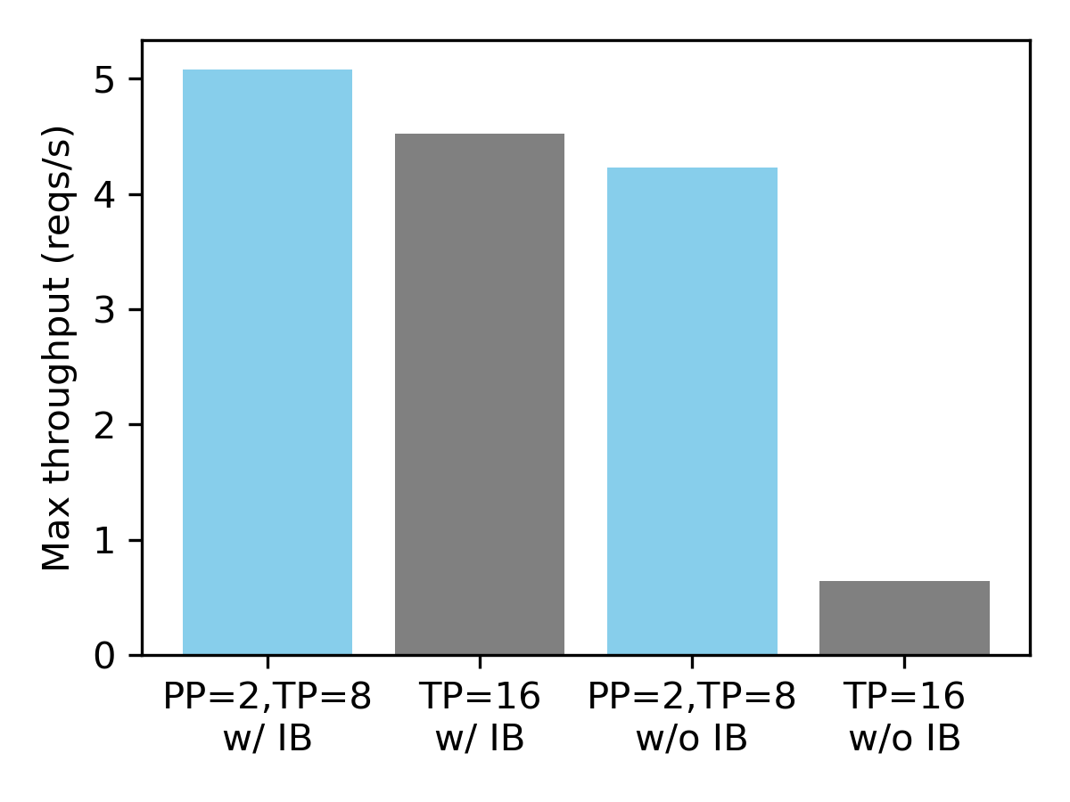 We have observed that pipeline parallelism is essential when the nodes are not connected via Infiniband. Compared to 16-way tensor parallelism, combining 2-way pipeline parallelism with 8-way tensor parallelism leads to 6.6x performance improvements. On the other hand, with Infiniband, the performance of both configurations is similar.
