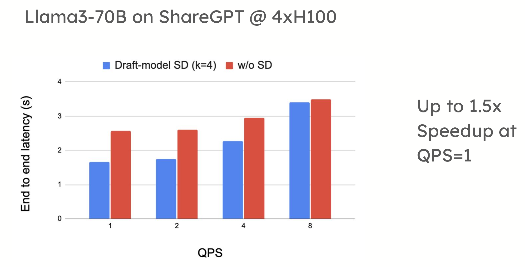 Speculative decoding in vLLM delivers substantial performance improvements, especially in low-QPS environments. As dynamic adjustments are introduced, it will become a highly effective tool even in high-QPS settings, making it a versatile and essential feature for reducing latency and increasing efficiency in LLM inference.